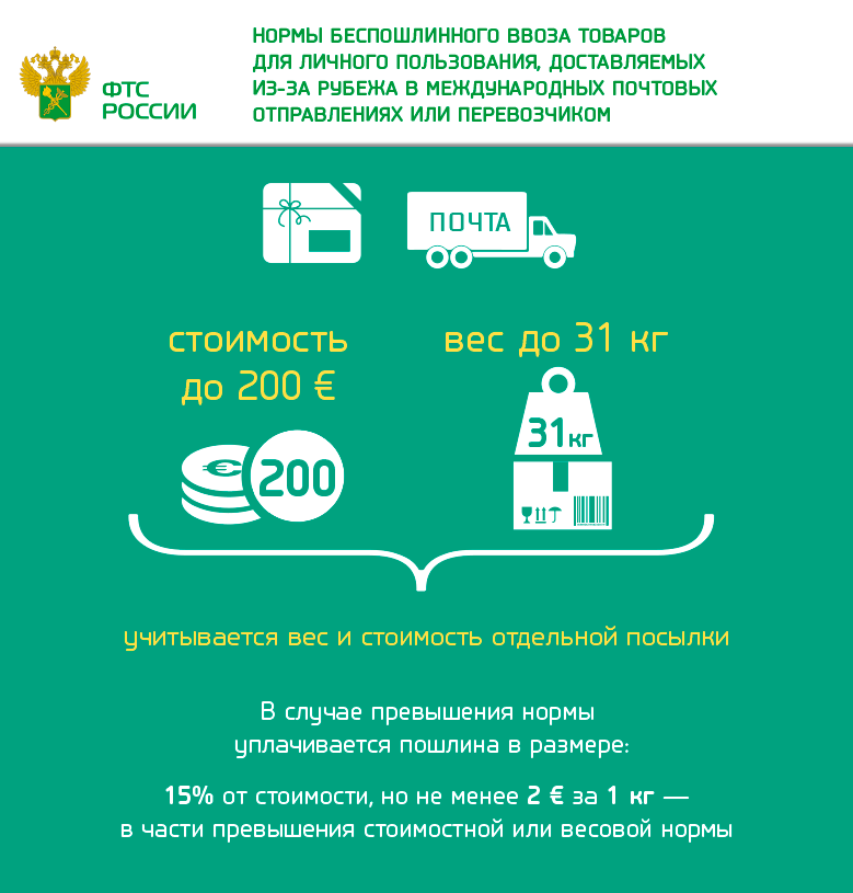 Согласно документу, имеющемуся в распоряжении ТАСС, по состоянию на сентябрь предложение РФ по установлению порогов беспошлинного ввоза в отношении товаров для личного пользования, ввозимых в рамках внешней электронной торговли, выглядело следующим образом: нынешние правила, по которым покупка свыше €200 или более 31 кг облагается пошлиной в 15% от стоимости, но не менее €2 за 1 кг веса, будут действовать до 30 июня 2022 года. Далее с 1 июля по 31 декабря 2022 года предлагается снизить беспошлинный порог до €100, а с 1 января по 31 декабря 2023 года - до €50, с 1 января 2024 года - до €20 при тех же условиях таможенной пошлины. С 1 января 2024 года также предлагается ввести пошлину в €1 за отправления, стоимость которых не превышает €20, а вес - 31 кг. (Отсюда.)
