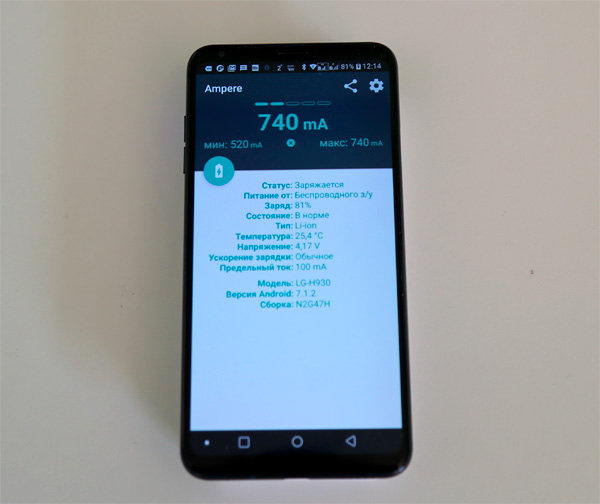 У меня же сейчас LG V30+, поддерживающий беспроводную зарядку, с такой штукой его в дороге подзаряжать удобно: сел пообедать, положил смартфон на батарею - он заряжается. Обычно берет, кстати, 0,75А - для беспроводной зарядки это вполне неплохо.