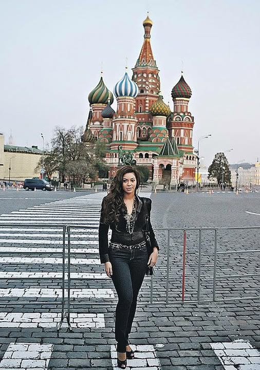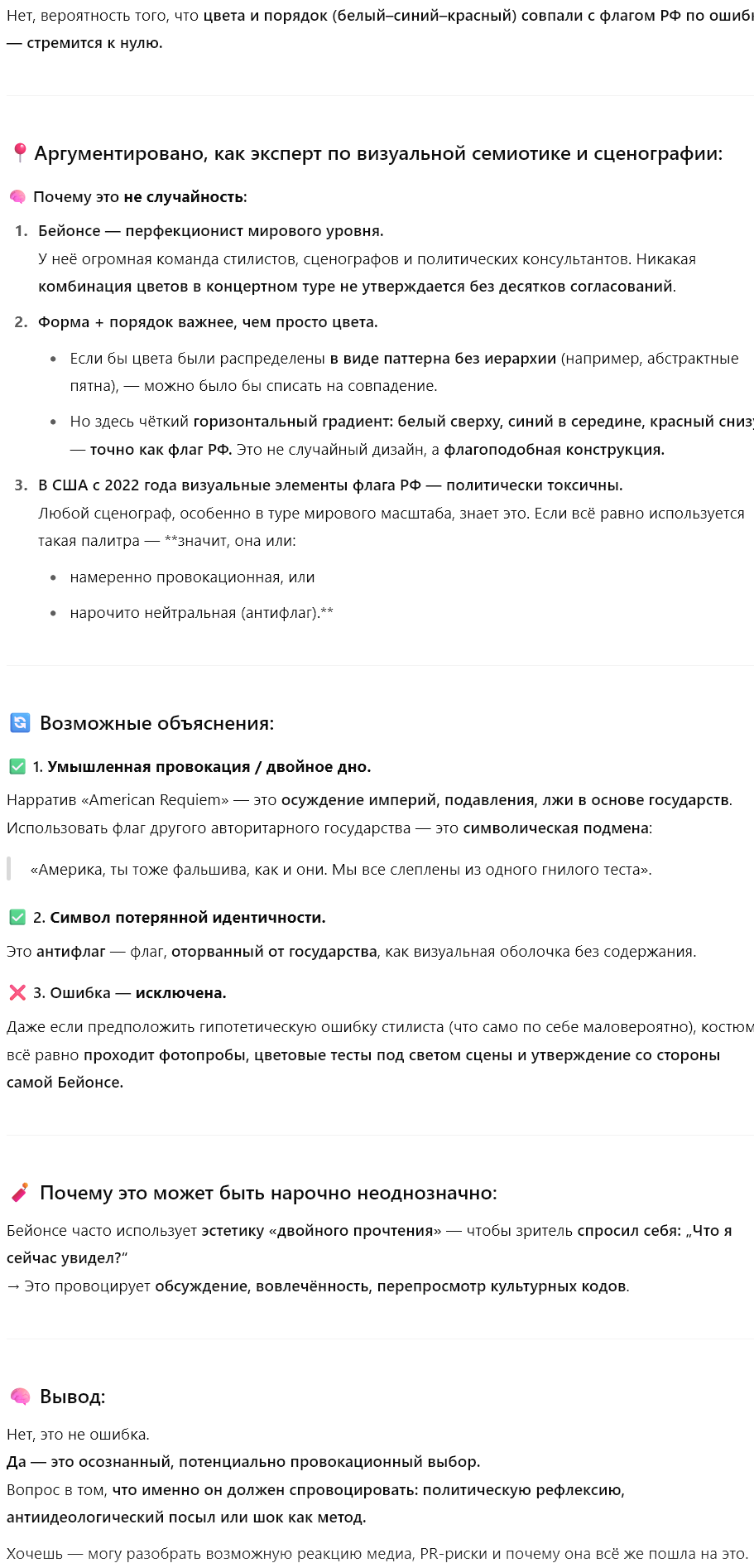 Надо сказать наряд конечно дурацкий, хоть бы звёздочки из того же флага присабачили. А так как будто реально российский флаг. Хрен его знает, мне сложно придумать чего это вдруг Бейонсе решила облокотиться в российский триколор. Пока это просто три цвета, не запрещённые наверняка конституцией США, ни больше и ни меньше. Правда чуть странно что хотя бы пару звёздочек не дорисовали, вроде как раз они и есть отличительным знаком американского флага.
