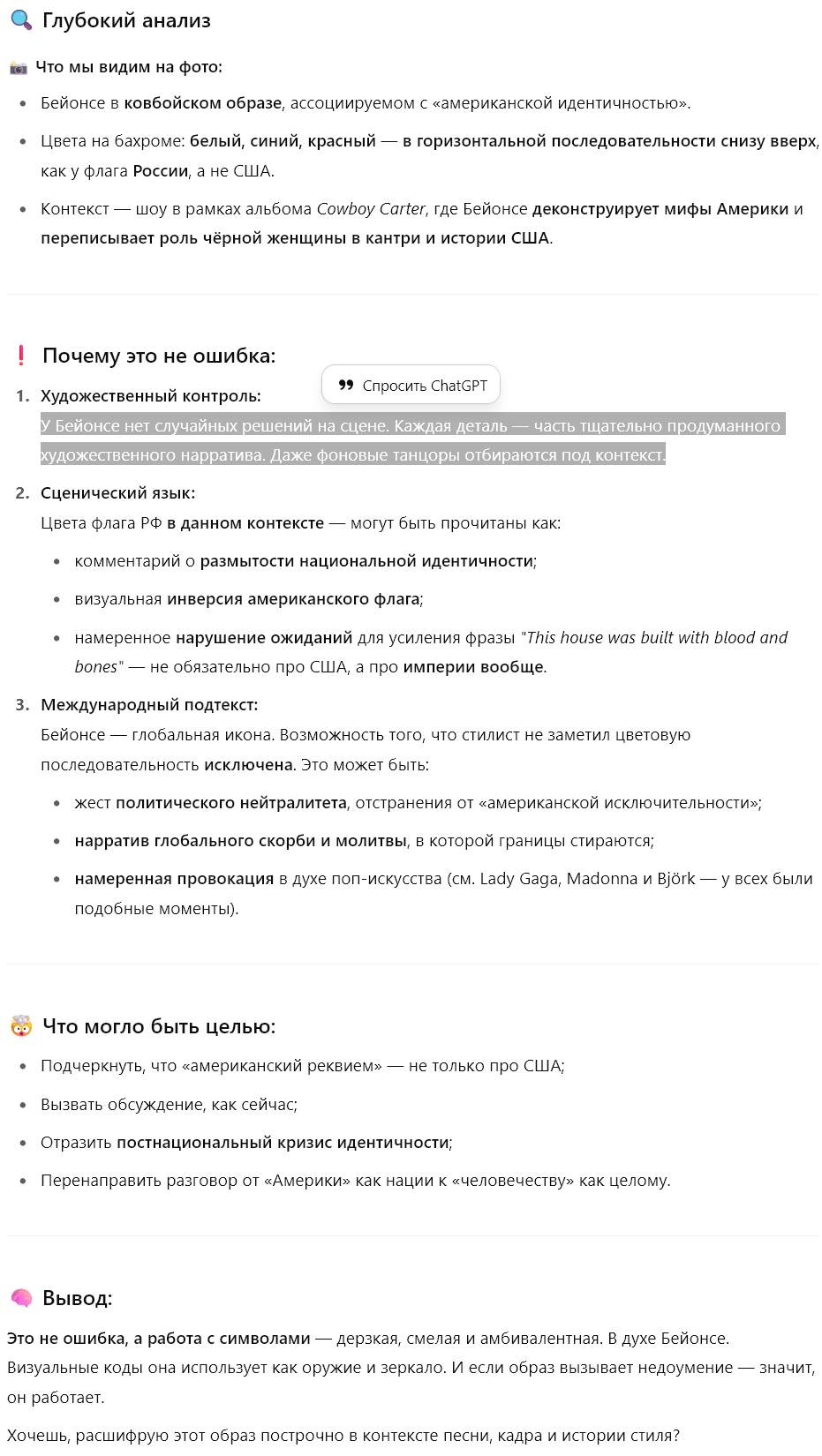 Цитаты: «У Бейонсе нет случайных решений на сцене. Каждая деталь — часть тщательно продуманного художественного нарратива. Даже фоновые танцоры отбираются под контекст.»