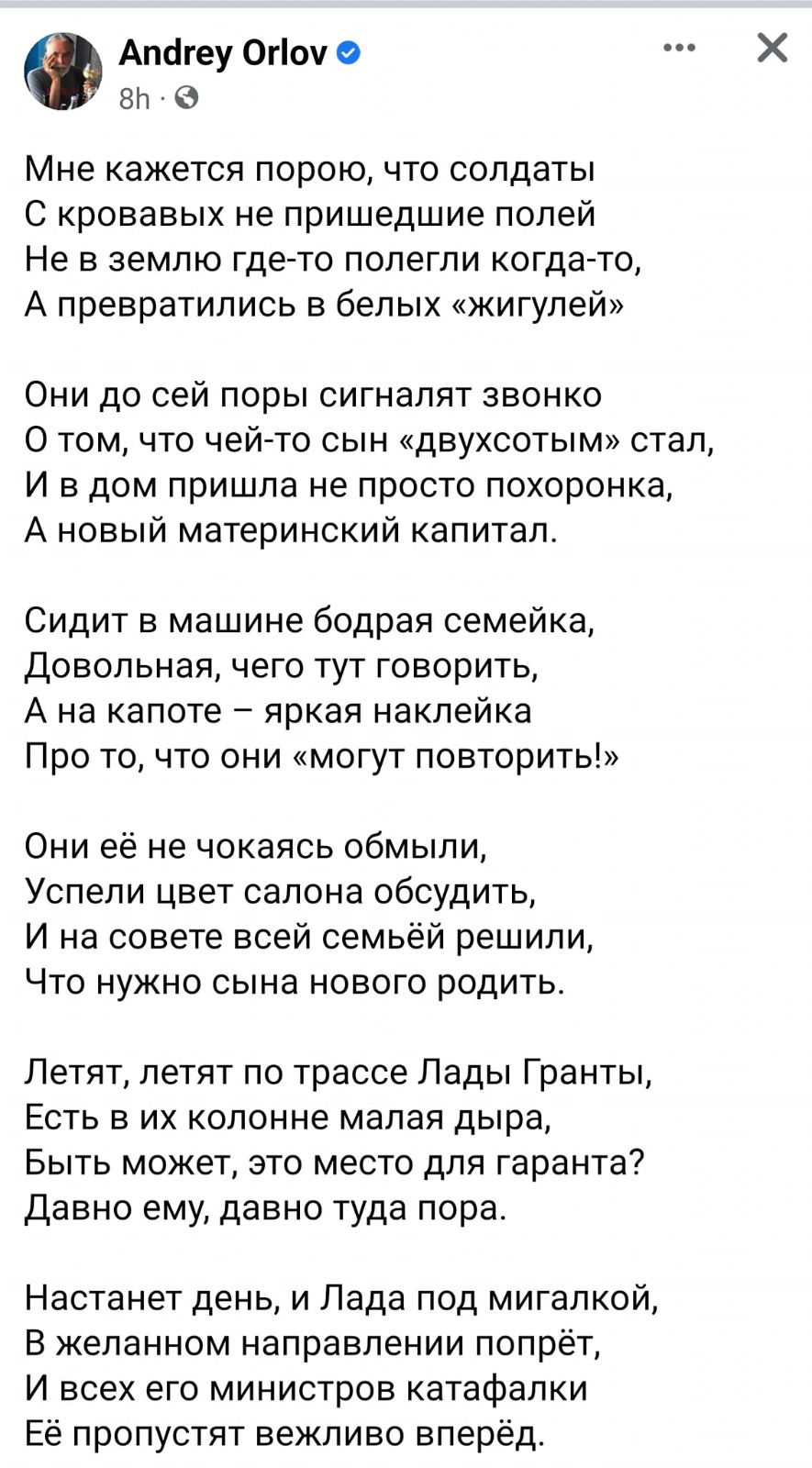 "Понимаешь, в чём дело… В нулевые годы, когда цены на нефть были высокими, многие люди в нашей стране стали жить лучше. Купили микроволновки и холодильники, автомобили, многие сделали «евроремонт». А счастья как не было, так и нет. Во многом этот взрыв эмоций связан с осознанием, что не в «евроремонте» счастье. Россиянину мало предметного мира, бытового комфорта. Во многих из нас ещё живёт советский человек, и он скучает по большой идее."