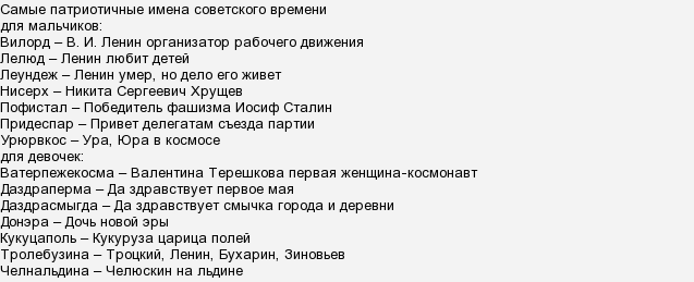 В Советском Союзе нередко детям давали имена, составленные из всяких Ленина-Маркса, Первого мая, Коммунистического интернационала молодежи и так далее. В результате появлялись имена Марксен (Маркс-Энгельс), Вилен (Владимир Ильич Ленин), Владлен (Владимир Ленин), Владилен (он же), печально известная Даздраперма (Да здравствует первое мая), ну и Ким (Коммунистический интернационал молодежи).