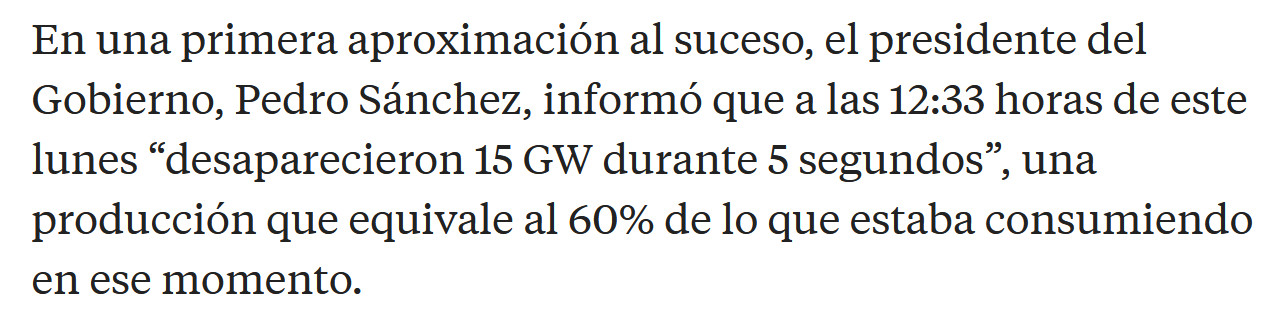 В первом приближенном отчете о происшествии премьер-министр Педро Санчес сообщил, что в 12:33 в понедельник «на 5 секунд исчезло 15 ГВт», что соответствует 60% потребляемой в тот момент энергии.