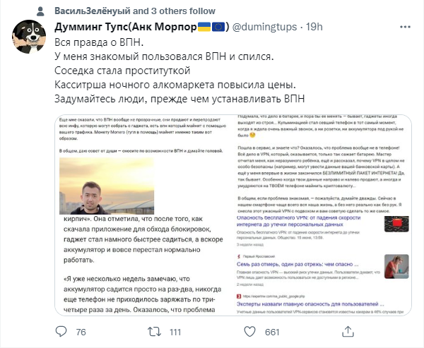 Поставил впн - и стал сочувствовать украинцам, становлюсь русофобом, от меня отвернулись родственники и одноклассники. Боюсь, что еще немного - и продам родину за печеньки, буду радоваться если Путин заболеет или окажется в тюрьме. Подумайте, посоны, прежде чем ставить впн