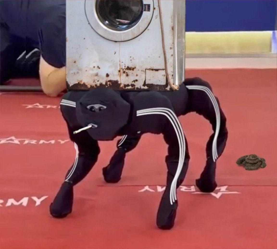 Эти прекрасные люди, конечно, всячески пытались закамуфлировать несчастное кибернетическое животное, но не узнать в нем китайского робота Unitree Go1 стоимостью $2700 - невозможно.
