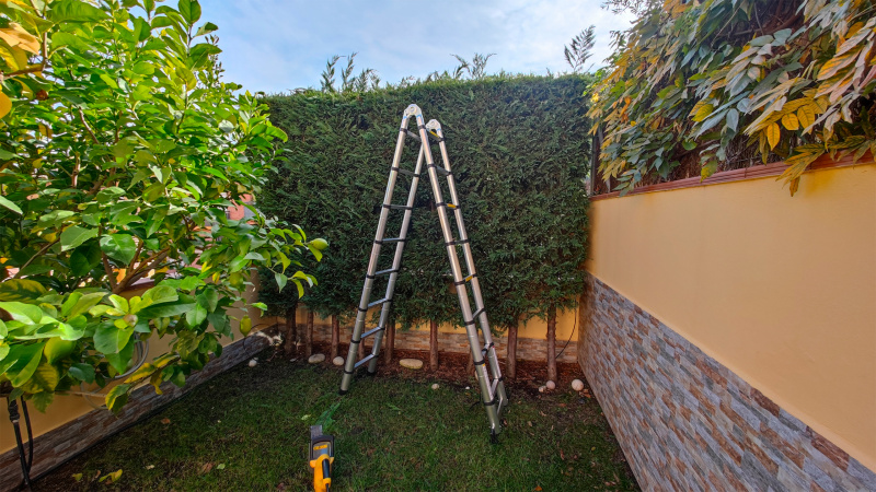 Интереснее было посмотреть, как она себя поведет в варианте длинной приставной лестницы на улице, где нужно залезать на большую высоту (тут холм, участок над улицей возвышается на заметную высоту). Ну и тоже отработала отлично - все как нужно. Дотянулись до всего, до чего должны были дотянуться, все сделали, все подстригли, теперь изгородь - в нужной кондиции. (Да, я знаю, что незачем делать такую высокую изгородь, ее нужно обрезать раза в три, а лучше вообще убрать и не париться со всякими лестницами - мне это писали.)