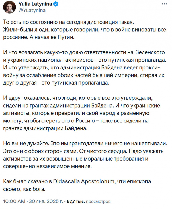 Красиво эта женщина всё обозначила! Все, кто против её мнения (тупого и предубеждённого на самом деле) - неискренние грантоеды. И только одна госпожа Латынина бескорыстна, как солнечный свет.