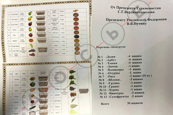 Продуктовые корзины Владимир Путину также подарили Александр Лукашенко (три ящика алкоголя, шоколад и сырно-колбасная корзина), Ильхам Алиев и новый глава Туркменистана Сердар Бердымухамедов, который передал президенту 30 ящиков овощей и фруктов.