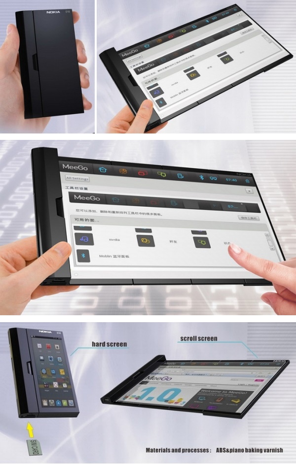 Промышленный дизайнер Вонг Иифеи (Wang Yifei) разработал идею раскладывающегося телефона Nokia E10, который может за счет выдвигающегося большого экрана превратиться почти в аналог планшетного компьютера. В сложенном, компактном состоянии телефон Nokia E10 по габаритам только немного превосходит обычные мобильные телефоны.