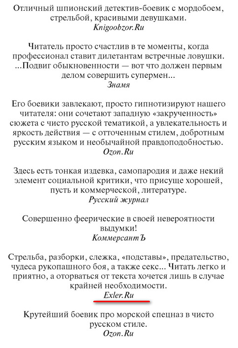 На второй странице ко всем трем книгам "Белой гвардии" опубликованы отзывы. С удивлением обнаружил, что я тоже свой отзыв написал. Хотя ни одну из трех книг серии "Белой гвардии" не читал пока. Ну, бывает, бывает. Надо будет прочитать. А то уже отозвался про рукопашный бой и секс, а сам ни в зуб ногой.