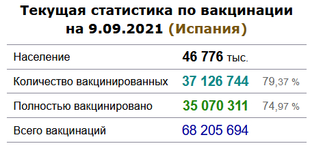В Испании почти 80%: здесь сейчас активно прививают подростков от 12 лет. О бустерной вакцинации в Испании пока не говорят.
