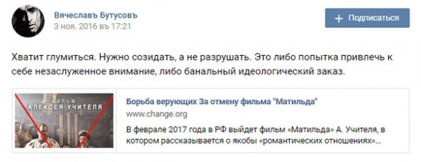 Бывший лидер свердловской рок-группы «Наутилус Помпилиус» Вячеслав Бутусов подписал петицию за отмену незаконченного фильма режиссера Алексея Учителя «Матильда». Об этом Бутусов написал в социальной сети.