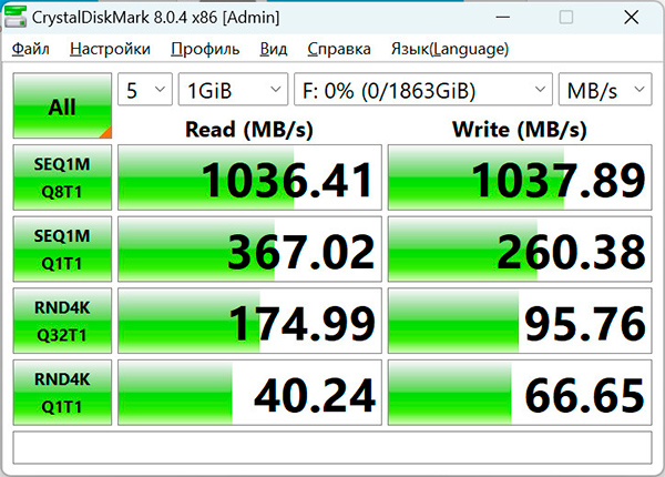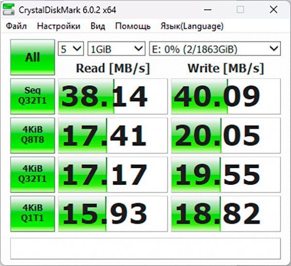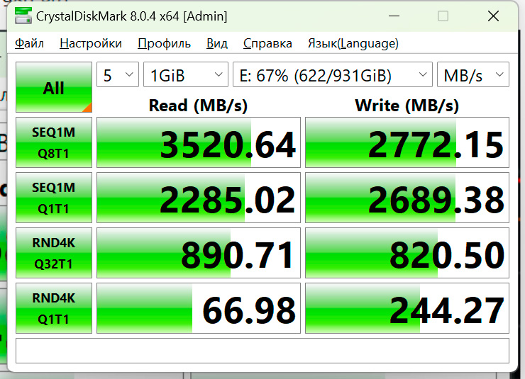 Так вот, при подключении к ноутбуку родным кабелем через Type-С - скорости выдавались такие. Очень так себе для SSD, конечно, но хотя бы терпимо.