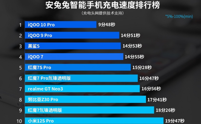 Победителем «гонки» стал представленный вчера iQOO 10 Pro. 200-ваттный блок питания позволяет смартфону полностью (с 5 до 100%) зарядить аккумулятор всего за 9 минут 48 секунд. На второй строчке рейтинга с приличным отрывом от лидера расположился iQOO 9 Pro с показателем 14:51, а на третьей — Black Shark 5 (14:53). За ними следуют iQOO 7 и Red Magic 7S Pro.