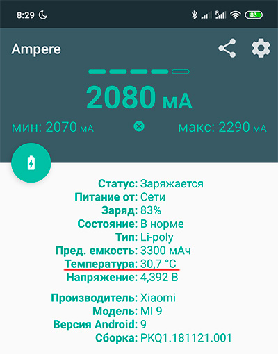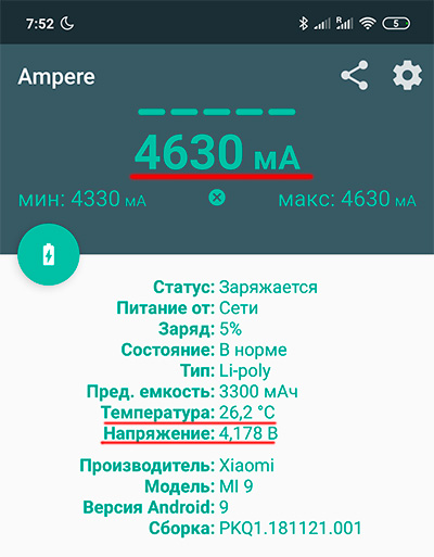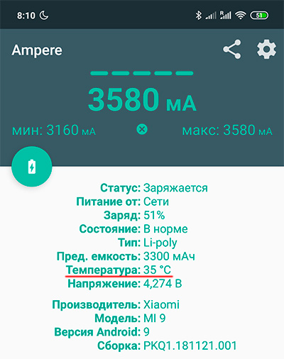 За ночь разрядил смартфон полностью, с утра поставил на зарядку. Выходные параметры на адаптере пока замерить не смог - там выход Type-C, а не USB 2.0, так что мне нужно сначала найти странный кабель Type-C - microUSB папа-папа, чтобы суметь подключить приборчик. Но там, собственно, важнее всего то, что у нас поступают на смартфон, а это как раз можно все измерить отличной программой Ampere, которая показывает напряжение и ток заряда на смартфоне, а кроме того, еще и показывает температуру аккумулятора, что очень важно. Да, при этом использовался самый обычный кабель Type-C - Type-C, который я покупал для моего ноутбука. Причем кабель еще и длинный - 1,5 метра.