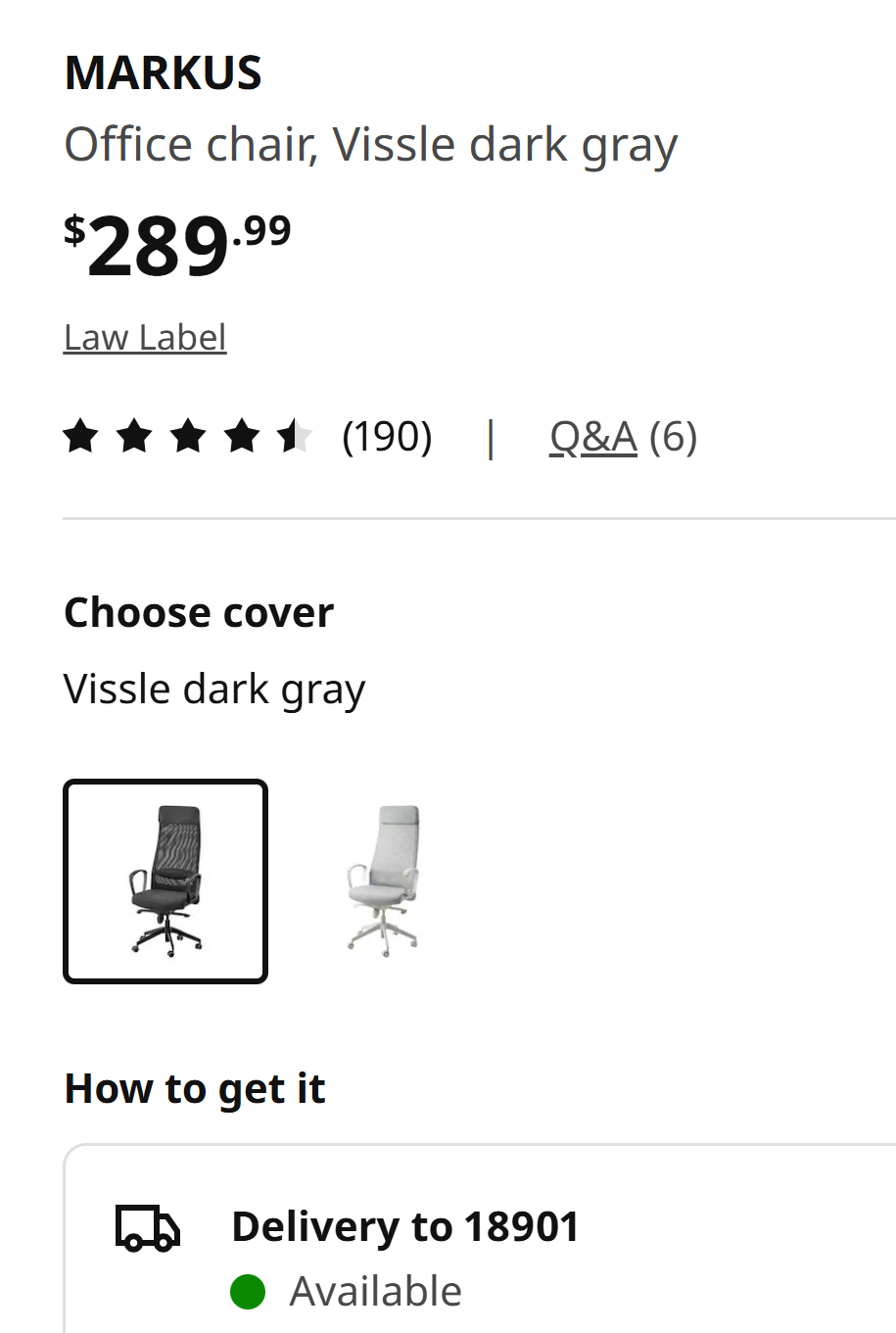 Ну, поехали действительно в ИКЕА. Но время было уже обеденное, очереди из машин в ИКЕА не было. Дошли до секции с креслами, посидел, пощупал - было не так много вариантов, но мне MARKUS понравилось прям сразу же. Оно было черное, темно-серое и светло-серое. И все были в наличии (это в ИКЕА видно по ценнику). Посидел, поерзал - вообще класс!