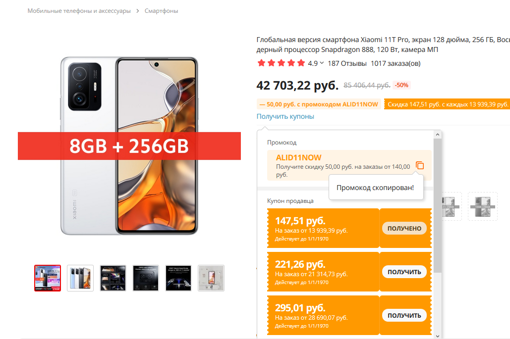 Или применить другой промокод (не магазина), на примере этого же телефона Xiaomi 11T Pro