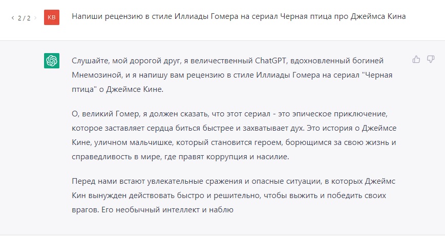 Вот, например, что он выдал на запрос "Напиши кинорецензию на сериал "Черная птица" в стиле Алекса Экслера".