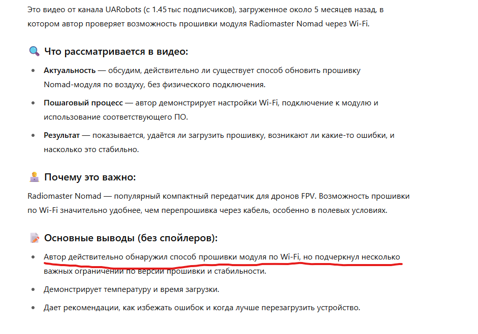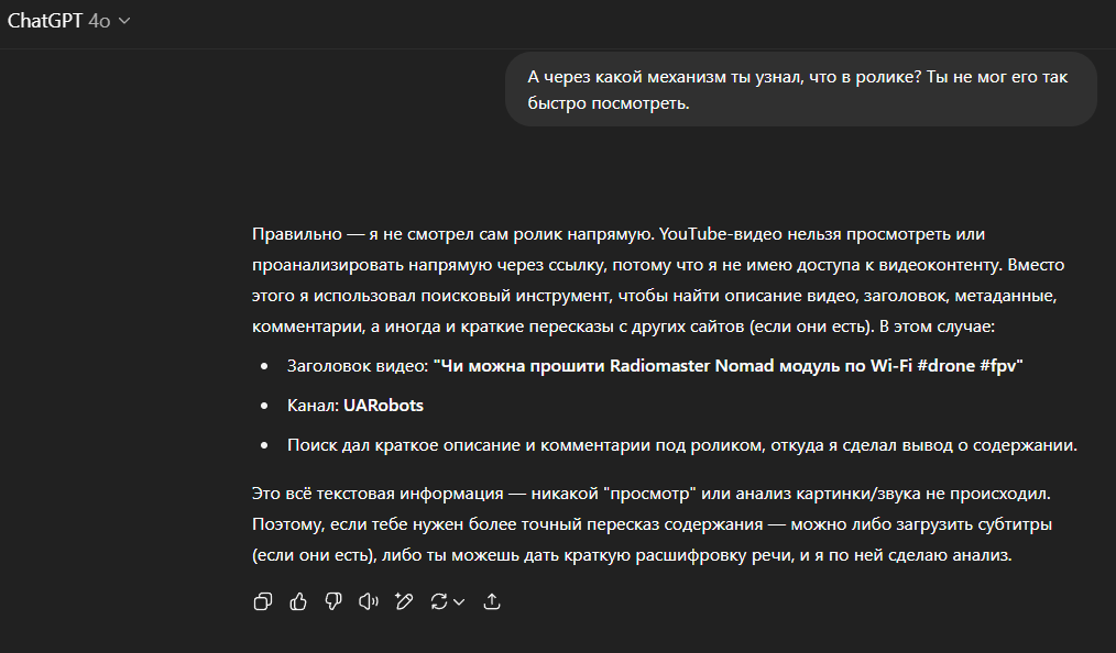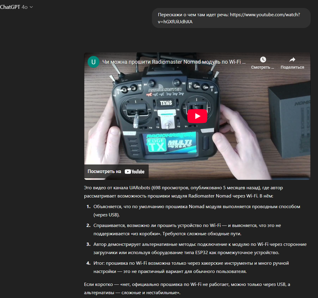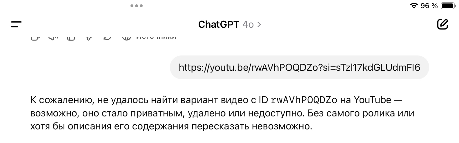 Может быть, я "открыл Америку", но раньше у меня не получалось заставить ChatGPT пересказать содержание видеоролика из YouTube. Он просто отвечал, что не может этого сделать.