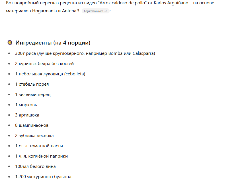 Начал проверять другие видео - да, тоже вполне справляется. Особенно удобно его использовать для составления рецептов из видеороликов. Не все кулинары напрягаются изложением рецепта в текстовом виде, и я попросил ChatGPT изложить рецепт риса с курицей в бульоне от известного шеф-повара из Страны Басков Карлоса Аргуиньяно (кстати, он очень прикольный дядечка, каждое его видео - целое шоу).