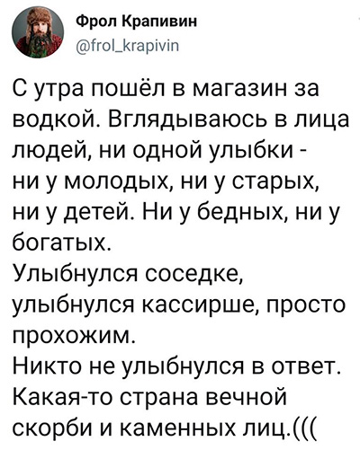 Вы чего в России все мрачные такие, а? Почему не улыбнетесь человеку? Ему хорошо, он с утра идет за водкой, весь день потом будет свободен, а вокруг - сплошные мрачные лица. Прям как-то обидно за человека, честное слово!