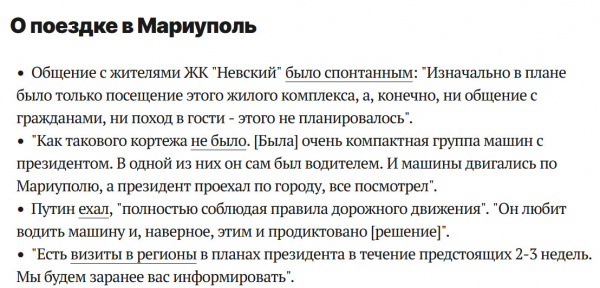 Впрочем, с другой стороны, они рассудили правильно - а чего напрягаться-то? Если кто-то в здравом уме поверит, что Путин действительно может посетить Мариуполь - тогда он во все поверит, никаких проблем. Тем более что двойничок более или менее похож, голосок у него такой же противный, да и несет он примерно ту же пургу, что и реальный бункерный, разве что словарный запас у них несколько разный, потому что реальный Путин в морской пехоте не служил, а, как известно, был столяр третьего разряда и таксист второй категории.