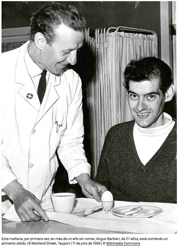 Вот статьи об этом - The story of Angus Barbieri, who went 382 days without eating, Angus Barbieri: un hombre increíble que sobrevivió 382 días sin comer и Angus Barbieri, la increíble historia del hombre que sobrevivió sin comer por 382 días, также в Википедии о нем есть небольшие статьи на различных языках.