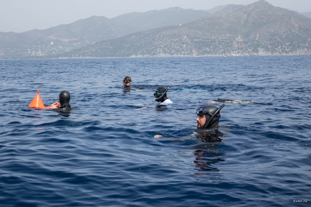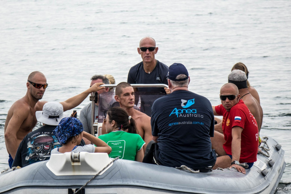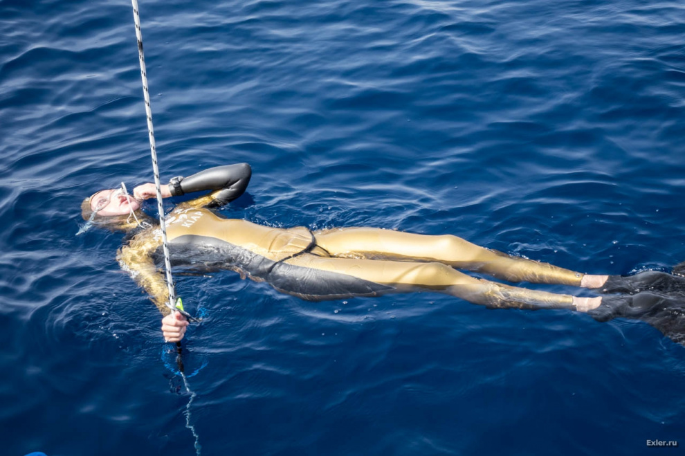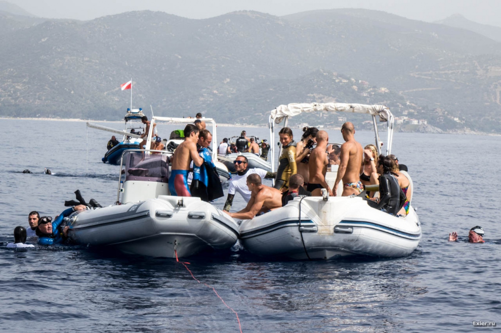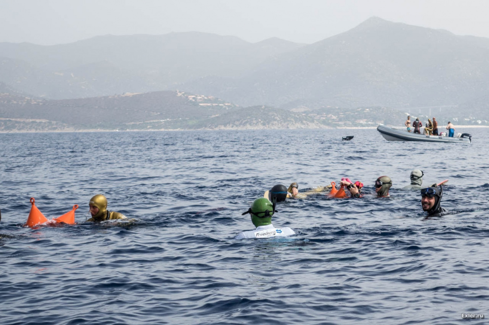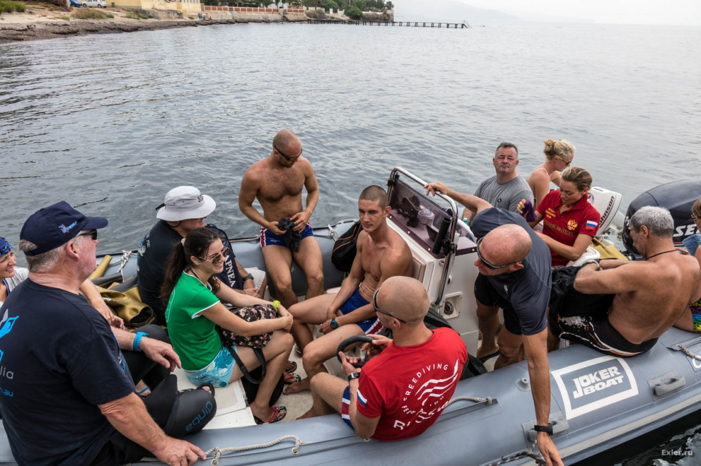 Фридайверы надевают костюмы и снаряжение (грузы - специальные ошейники или пояса с вшитыми свинцовыми бляшками) и готовятся отправляться к разминочным буйкам. Грузы надеваются для облегчения старта погружения - чтобы меньше сил тратить, они еще пригодятся.