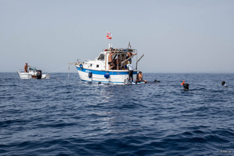 Вот на таких лодках осуществляется доставка фридайверов на место погружений. Плыть, кстати, не так уж и мало - минут двадцать на хорошей скорости.