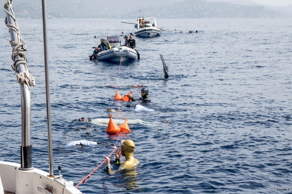Подъем из глубины. На видео видно, как Андреа командует страхующими - сначала на большую глубину уходит страхующий со скутером, потом отправляются двое сэйфети в ластах: они встречают спортсмена на глубине 15-20 метров.