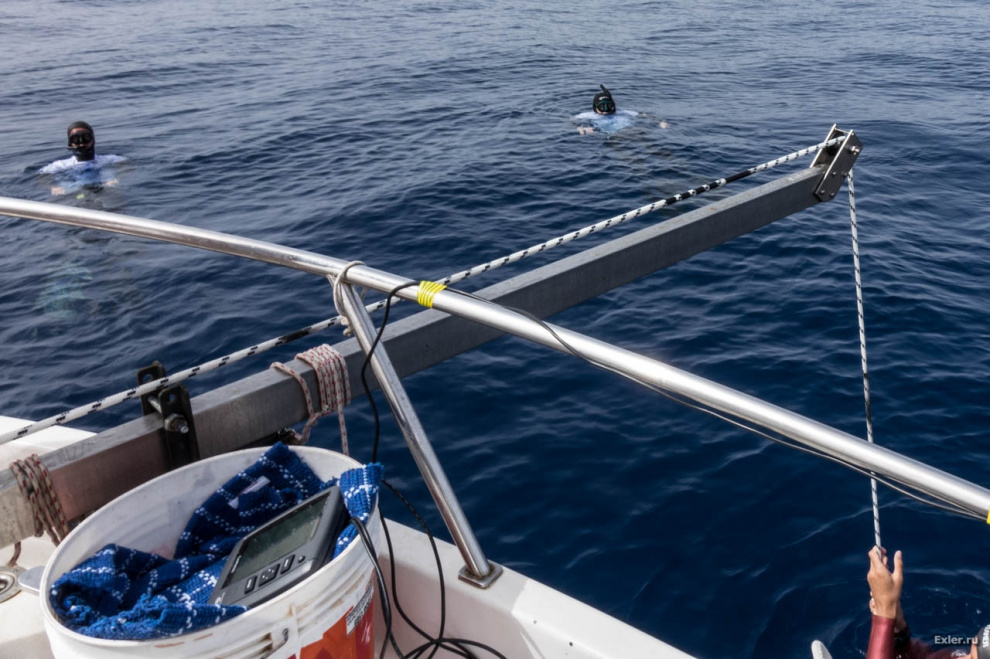 Видео финиша Натальи - она легко взяла 90 метров, завтра будет нырять на 93. Извините, что концовка видео смазана: Наталья попросила меня кинуть ее очки, которые она оставляла на катере, я нажал кнопку стоп и промахнулся. Заметил это только через несколько секунд. Но зато вы воочию можете наблюдать мою пробежку по катеру с точки зрения болтающейся на шее камеры.