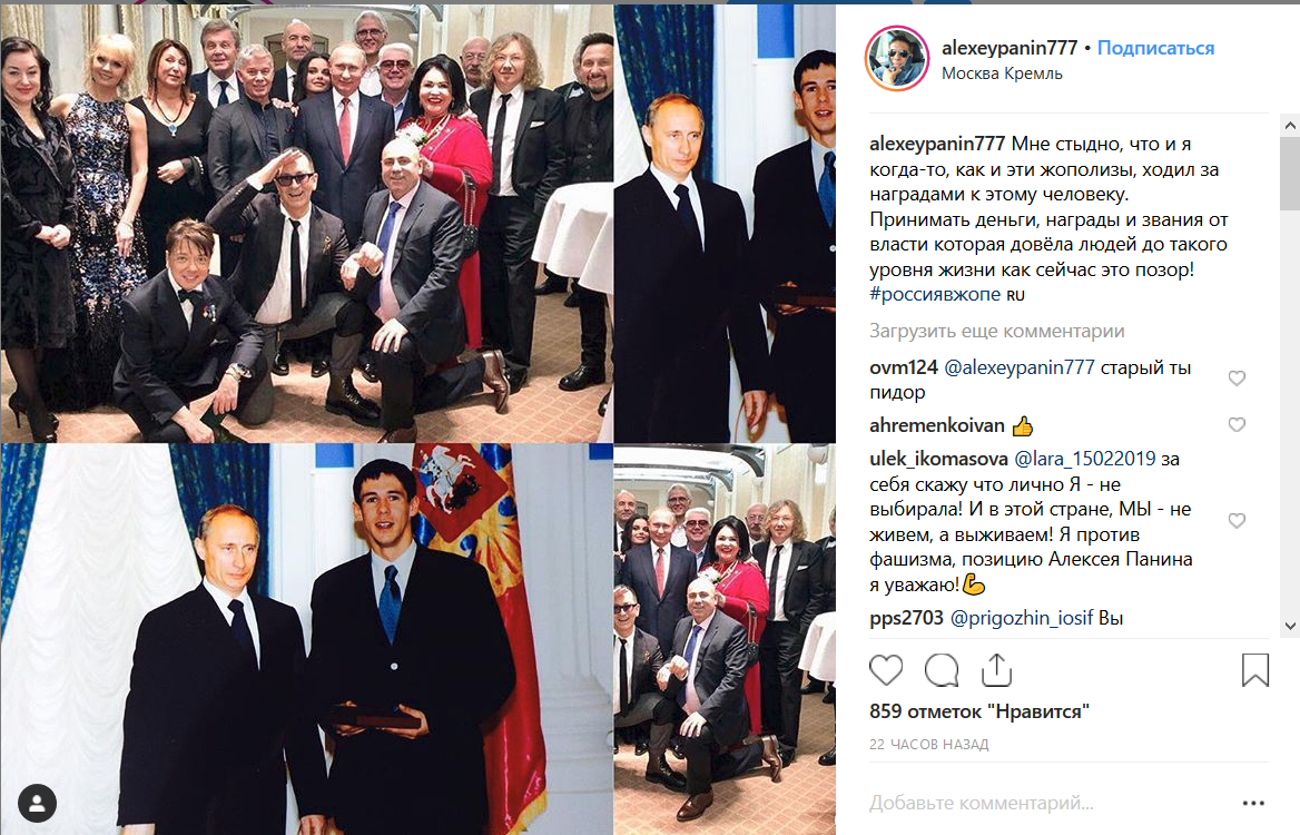 Какая прелесть! Актер Алексей Панин вместе с остальными жополизами годами ходил к Путину за медальками. Принимал деньги, награды и звания. Но как только у Панина оказался в кармане паспорт с американской визой и билетом в один конец, о чем он сам на днях сообщил, Панин вдруг обратил внимание на то, до какого уровня жизни эта власть довела людей. И, разумеется, тут же воспылал благороднейшим негодованием, тут же! В Штаты прилетит - будет писать мемуары о своей великой борьбе с кровавым режимом, я так полагаю.
