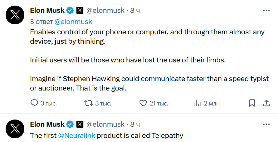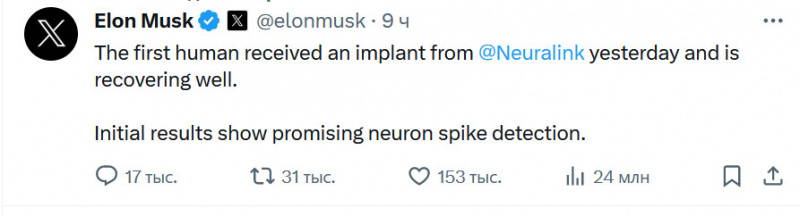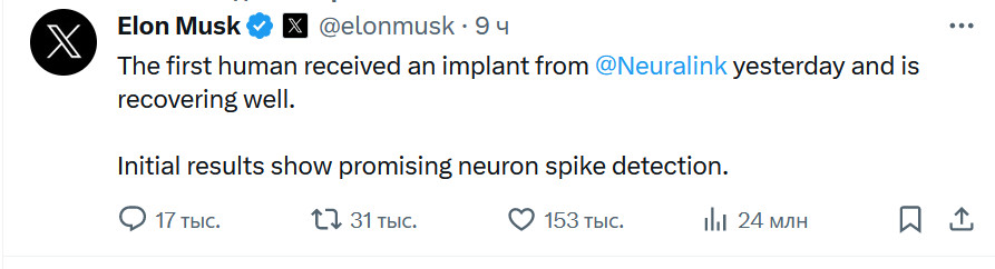 Илон Маск, основатель и владелец компании Neuralink, написал в своем Твиттере о том, что первый чип этой компании вживлен человеку. Эти чипы, по словам Маска, должны позволить парализованным людям управлять своими устройствами.