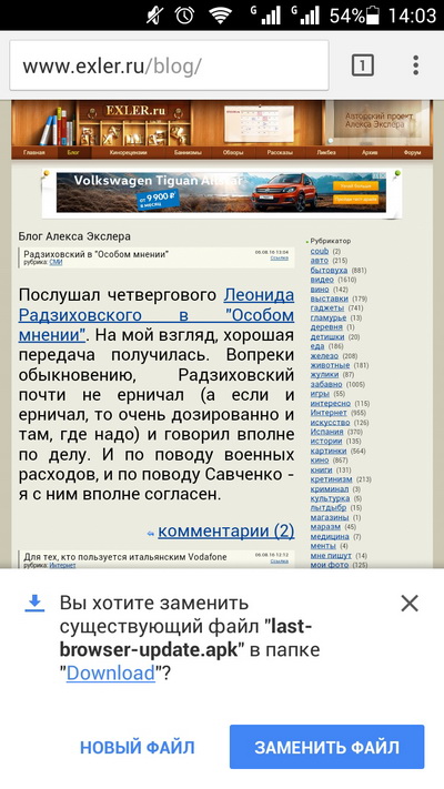 Пришло несколько писем о том, что при заходе на Exler.ru со смартфона появляется крайне подозрительное предложение скачать некое приложение. У меня ничего подобного не появлялось, но я помню, что некоторое время назад подобным образом работала некая дырка в Google Adsense - сейчас оказалось то же самое.