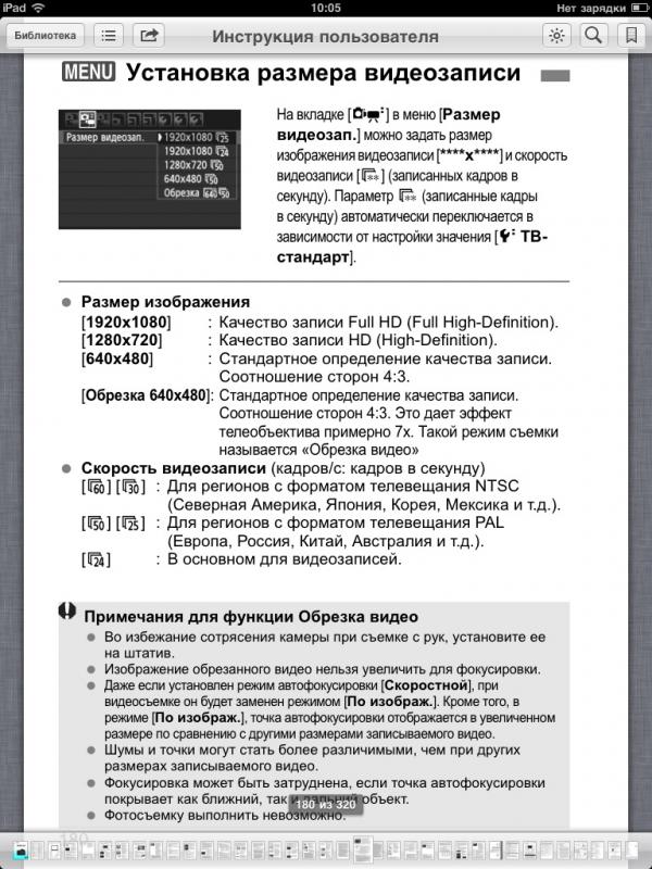 Вообще на iPad очень комфортно читать формат PDF - на порядок комфортнее, чем на любых ридерах, где его читать практически невозможно. Однако тут все зависит от верстки. Если в PDF сверстана маленькая по формату страницы инструкция - например, к фотоаппарату, - то это читается просто идеально. (Все скриншоты ниже - кликабельны, чтобы посмотреть в полноразмере.)
