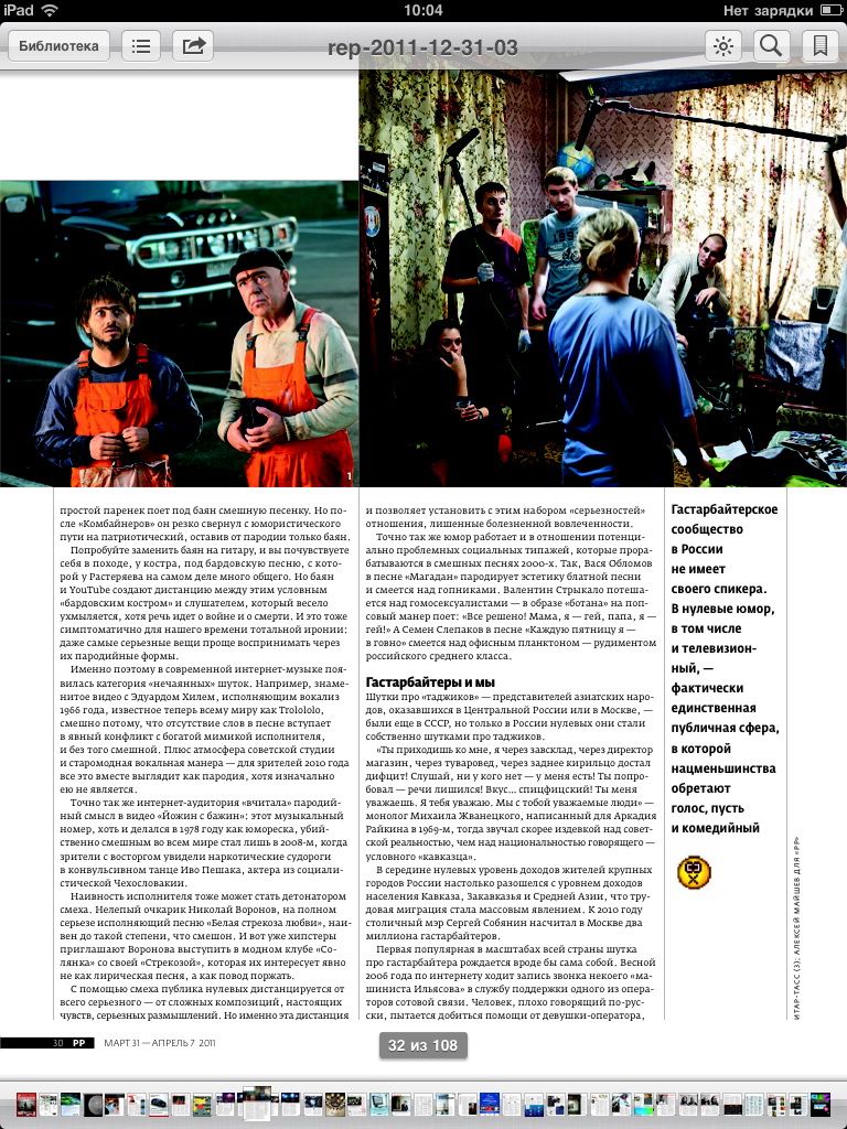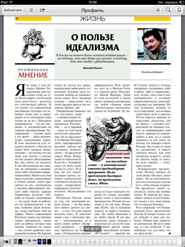 Однако периодические издания обычно имеют заметно более крупный формат. Самый небольшой из них - формат еженедельников типа "МК-бульвар" или "Профиль". Они по размеру чуть больше экрана iPad, поэтому читаются вполне неплохо.