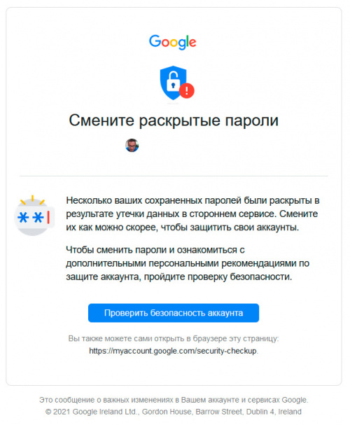 Я сначала подумал, что это какое-то жулье - ссылка, наверное, ведет на какой-нибудь фишинговый сайт и все такое. Потому что в упор не понятно, что за сохраненные пароли (я в Гугле вроде никакие пароли не сохраняю и не держу), что значит "в результате утечки данных в стороннем сервисе", и почему мне об этом вообще сообщает Гугл?!!