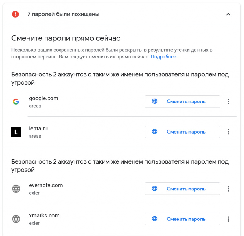 Ну и конечно же, если пароли храните в облаке - есть и более сложные варианты, например когда например гугл знает, что на сервисах А и Б у вас одинаковый пароль, то в случае утечки с А учетка на сервисе Б тоже будет считаться скомпроментированной.