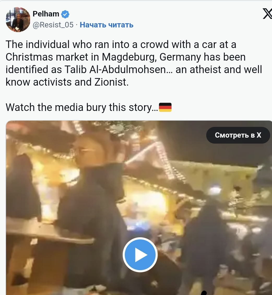 Мужчина въезжает на арендованном автомобиле в толпу людей на рождественском рынке в Магдебурге. Погибают по меньшей мере два человека, в том числе маленький ребенок. Преступник недавно дал путаные комментарии в Интернете. Он считал немецких полицейских проводниками исламизма и агитировал за AfD.