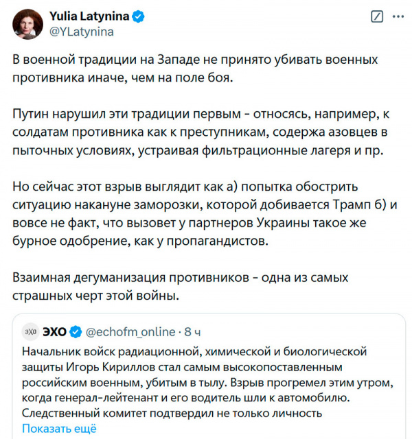 Поразительно, что Юля считает легитимной целью начальника Еленовской колонии и генерала Сулеймани, но не Кириллова.