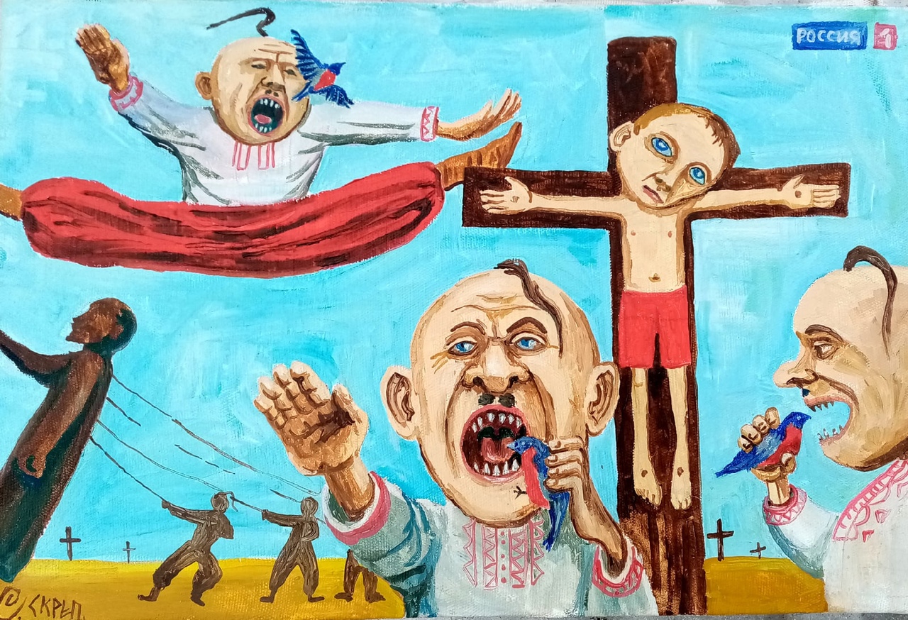 Оно понятно, что это какое-то очередное творение госпропаганды. Но что художник хотел сказать своим произведением? Судя по советскому флагу, это Вторая мировая. То есть это немецко-фашистский танк едет по русской деревне. А наперерез ему - мужественный русский мальчик, повесивший на спину портрет Гоголя (в школе выучить задавали) а на грудь - портрет Пушкина (тоже задавали, но он не выучил). А почему тогда немецко-фашистский танкист так хорошо говорит по-русски? И почему фашист такой нерачительный? Зачем надо было патрон тратить, когда он на танке?