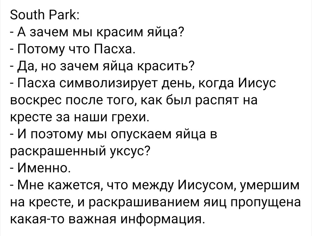 Святой Петр им отвечает, что, дескать, прежде чем в рай попасть, нужно ответить на какой-нибудь простенький вопрос из Катехезиса - вот, например, что такое Пасха?