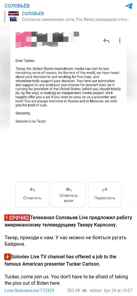 Плюс, пусть американские друзья поправят если ошибаюсь где (не слежу за местными реалиями), но вроде как FOX не государственная компания, а о пропагандистах на службе правительства в США я вообще не слышал. Этот Такер скорее всего просто медиаперсона которая работала на близкой к своей политической идеологии платформе. Вроде привычная практика, как и собственно увольнение. Этот Карлсон далёк от аналогии с Соловьевым.