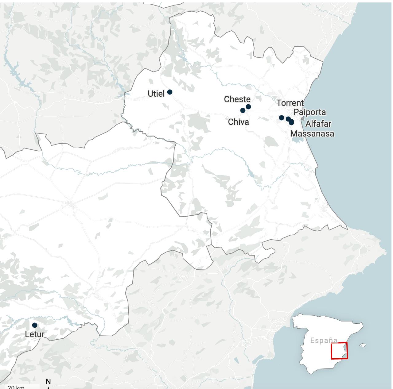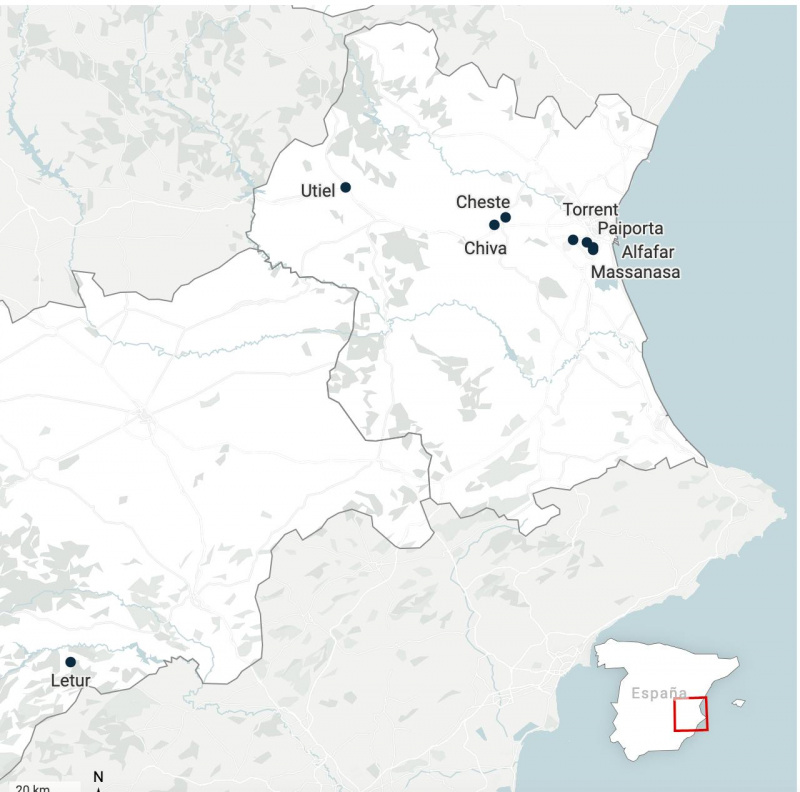 Эпицентр трагедии - ближайшие пригороды Валенсии, особенно городок Paiporta. Сам город Валенсия фактически не пострадал благодаря тому, что русло реки Турия, некогда протекавшей через весь центр, в 1960-е годы перенесли за пределы городской черты, а в старом русле появился знаменитый парк. Причиной переноса стало катастрофическое наводнение 1957 года.