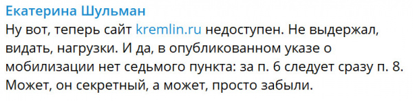 «По такому тексту призвать можно кого угодно, кроме работников оборонно-промышленного комплекса, у которых есть отсрочка на период работы, — расшифровывает указ политолог Екатерина Шульман. — О том, что мобилизация касается только находящихся в запасе и имеющих какие-то особо нужные специальности, сказано в выступлении, но не в указе». Шульман заметила также, что Путин назвал военную операцию «упреждающей», а не «специальной», как до сих пор.