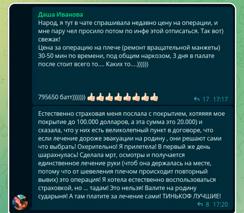 Интересная история. Вот так страхуешься на сумму до $100 тысяч, в первый день отпуска налетаешь на страховой случай, а "Тинькофф" выясняет, что дешевле будет тебя отправить обратно, а там уже лечение оплачивай самостоятельно. Мудро, да. Прям какой-то совсем новый уровень страховых услуг. А если "Тинькофф" выяснит, что тебя за границей дешевле пришибить, чтобы не оплачивать операцию? Такого пункта в договоре случайно нет?