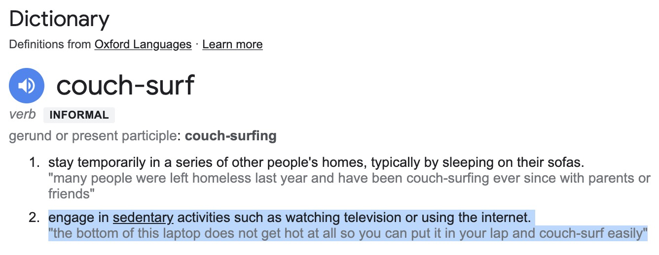 А давайте вы сначала разберетесь, что к чему, а потом будете комментировать? Ведь это название той самой гостевой сети происходит от названия явления ("stay temporarily in a series of other people's homes …"), а не наоборот. Загляните в словарь - там два значения, я выделил второе, которое как раз и означает "интернет-серфинг на диване":