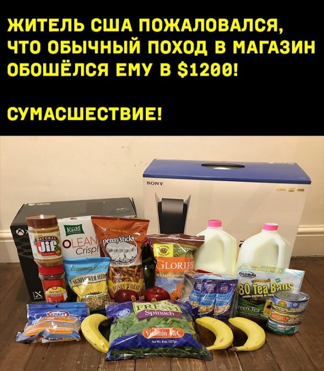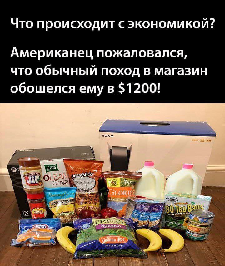Ха, тут немка одна жаловалась, что сходила в дешевый продуктовый и отдала под 90 евро. На фотке было больше жратвы, чем тут, хоть ей и не понадобилось укладывать всё в коробки от игровых приставок.
