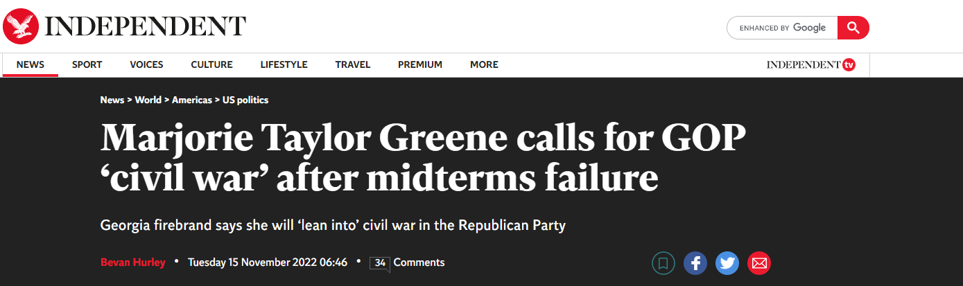 Слушай, утомил ты уже со своей пропагандой. Ваши левые (даже не ультра) несколько лет всю страну жгли и громили во имя поддержки чернокожих уголовников пока "ультраправые" сидели и молчали. Ваши левые политики призывали преследовать членов администрации президента и ты не возмущался. Ваши левые (даже не ультра) открыто в соцсетях призывали к уничтожению правых (даже не ультра) и ты не возмущался. А тут республиканская депутатша использовала эвфемизм описывающий положение дел и конфликт ВНУТРИ республиканской партии (сюрприз: республиканцы умеют думать головой и не боятся плыть против течения, тогда когда демократы всегда беспрекословно поддерживают линю партии, какой бы идиотской она ни была), так ты сразу на дыбы встал. Ты бы хоть английский подучил, что ли. Тут из заголовка понятно, что речь идет не о гражданской войне в стране, а о конфликте внутри парттии.