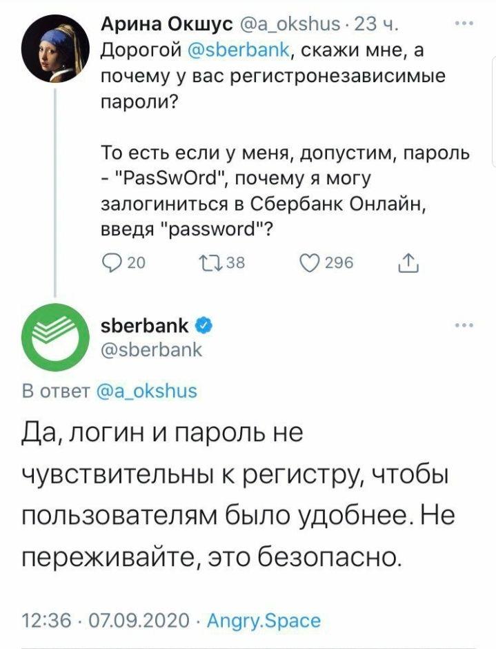 А что именно нужно знать про Сбер? По вашему, регистронезависимый пароль — очень плохо с точки зрения безопасности? Почему?